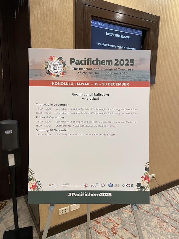 ハワイでのpacifichem2025 に参加してきまいした(organiser & presenter)。Pacifichem 2025 (20 Dec 2025, ) ANA08 : Chemistry for in vivo continuous biosensing system Designing Redox Mediators for FAD-dependent Glucose Dehydrogenase and Lactate Oxidase toward Wearable Applications、Seiya TSUJIMURA |